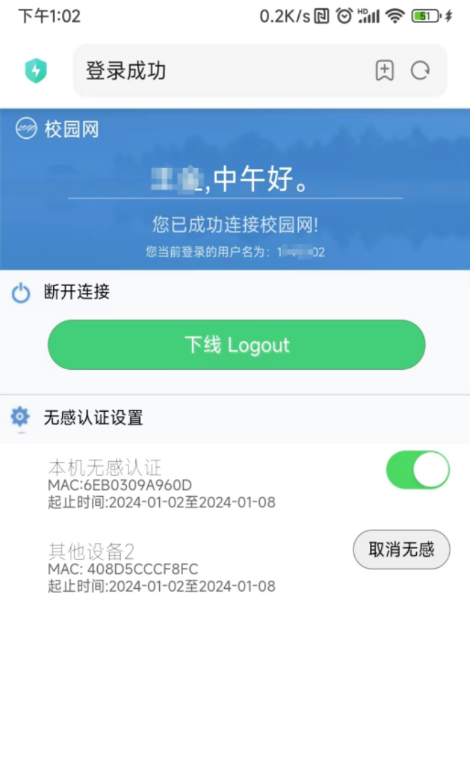 如果有线电脑也需要开启无感知认证,可以在认证成功页面手动开启(显示绿色为开启状态)。