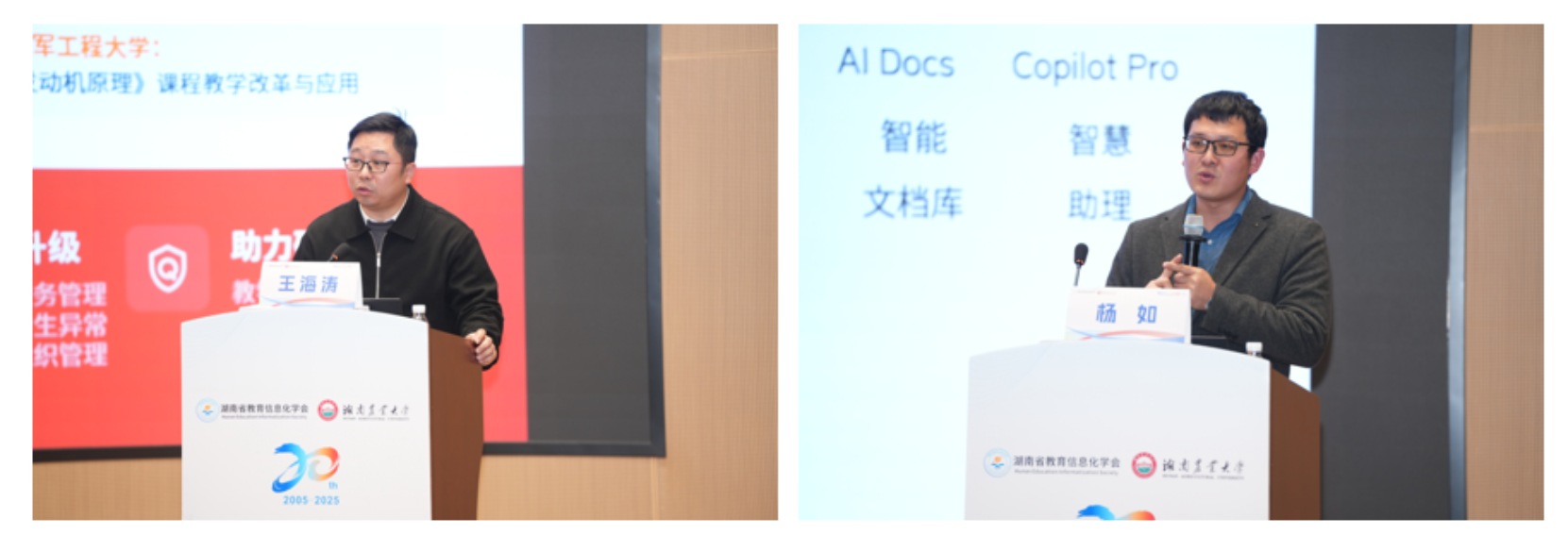 在行业技术报告环节,6家深耕教育信息化行业的企业进行了经验分享和产品展示。锐捷网络湖南分公司副总经理周里璋分享《彩光引领下一代园区网,AI赋能教育教学改革》,超星指针集团副总经理王丽洁分享《AI能力中心在高校落地的思考和实践——助力高校“十五五”建设发展》,武汉览山科技有限公司总监王海涛分享《AI赋能高校数字化落地方案》,金山办公教育解决方案专家杨如分享《WPS一站式AI协同办公平台赋能校园数智化建设》,正元智慧集团解决方案专家李靖翔分享《数据、物联与AI协同的新时期数智校园场景实践》,新华三集团教育科研技术部总监汪卫国分享《AI+教育科研创新发展探索与实践》等主题,展示了教育信息化领域的最新技术与应用成果。